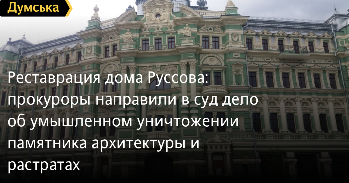 Как сообщает пресс-служба прокуратуры Одесской области, обвинительный акт подготовлен в отношении владельца части помещений дома Руссова и трех руководителей предприятий-подрядчиков, подозреваемых в умышленном уничтожении, разрушении и повреждении этого объекта культурного наследия (ч. 2 ст. 28 - преступление по предварительному сговору, совершенное группой лиц, и ч. 5 ст . 298 УК Украины — умышленное незаконное уничтожение, разрушение или повреждение объектов культурного наследия, их частей, а также памятников национального значения, совершенные должностным лицом с использованием служебного положения).