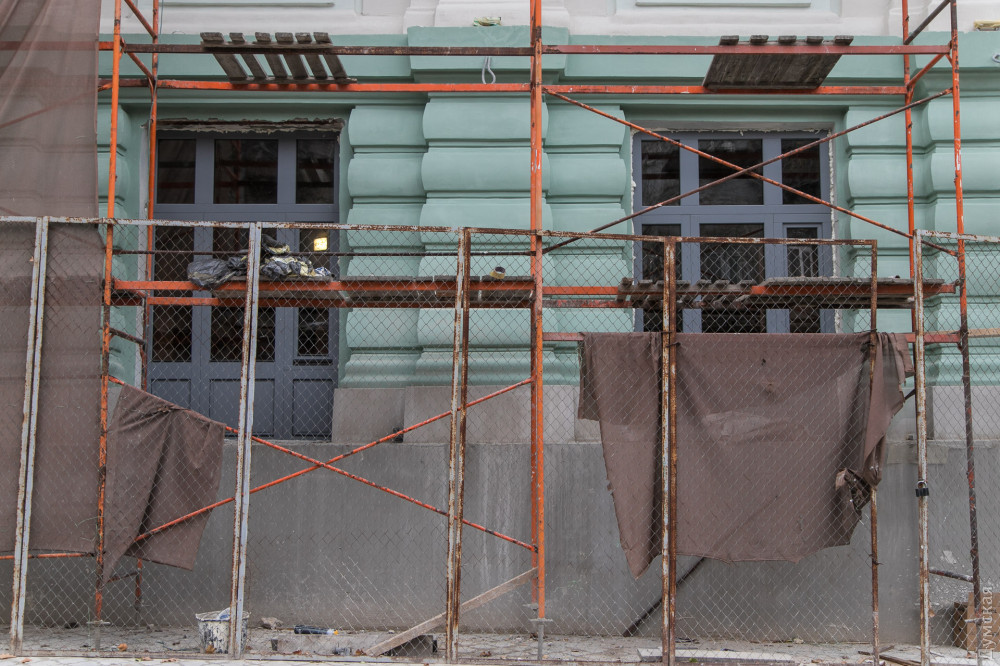 Здание обнесли строительными лесами, обтянули защитной сеткой. Ремонтные работы шли с разного рода интенсивностью, иногда полностью останавливаясь. Несколько недель назад подрядчик приступил к замене окон, что вызвало шквал критики. Вместо старинных резных рам, как заявили защитники культурного наследия, появился обычный металлопластик. Позже, правда, выяснилось, что ставят не пластиковые, а дорогие окна из дерева, но вопросы все равно остались.