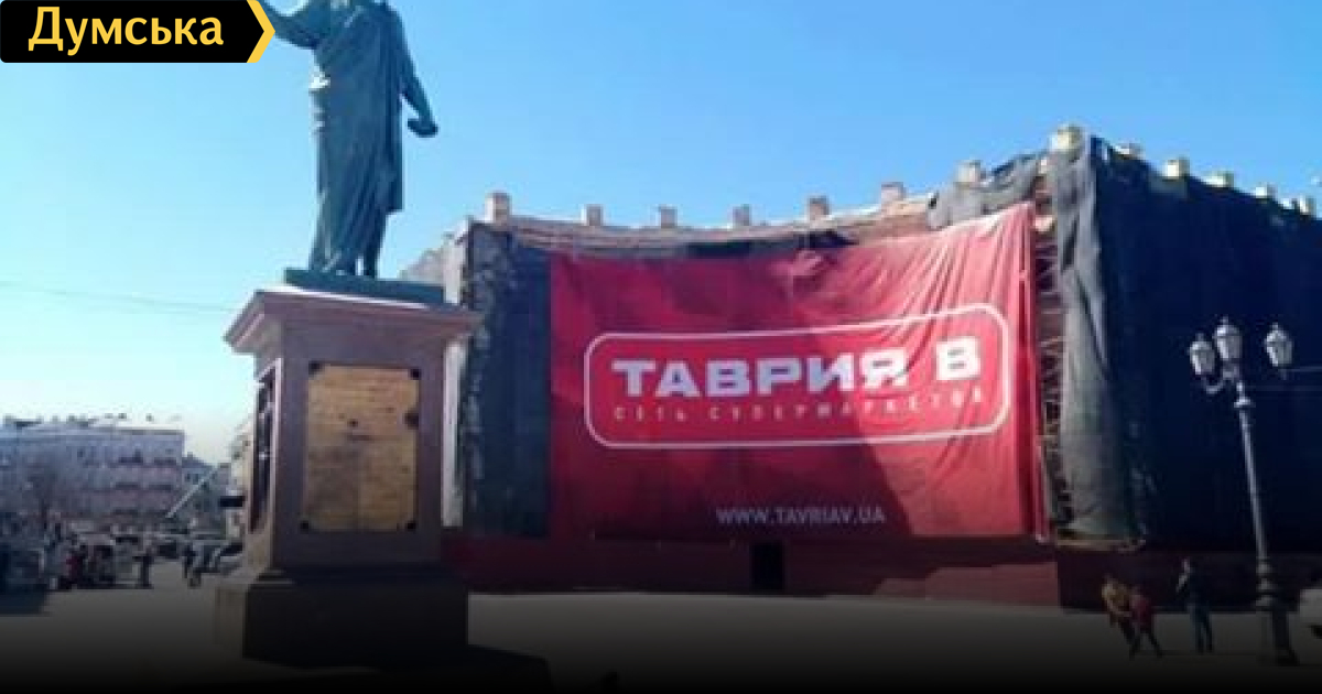 Торговая сеть «Таврия В« разместила свою рекламу на сетке, закрывающей фасад полуциркульного здания за спиной Дюка.