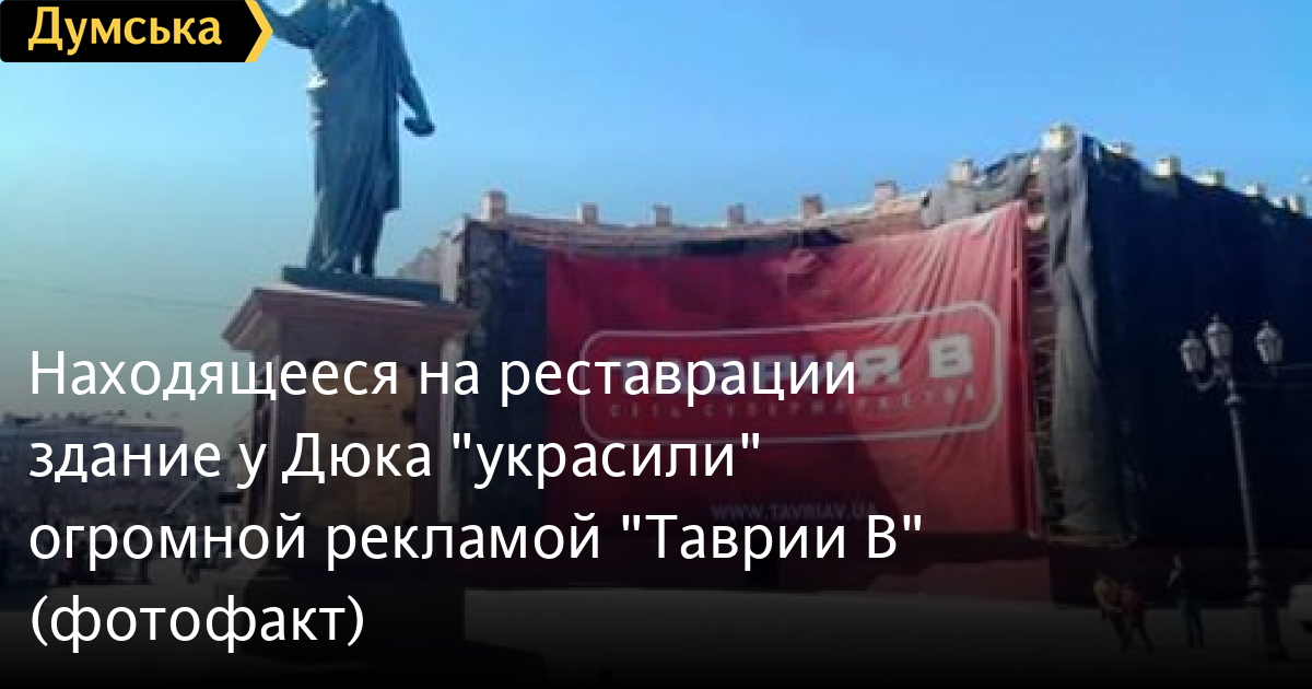 Торговая сеть «Таврия В« разместила свою рекламу на сетке, закрывающей фасад полуциркульного здания за спиной Дюка.