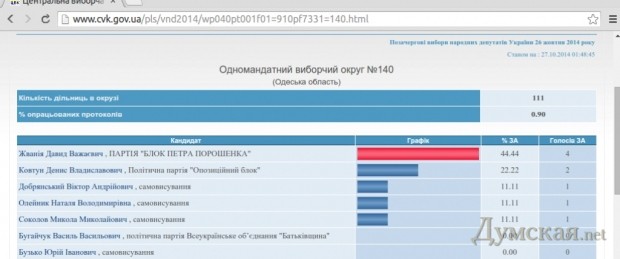 Творящиеся на округе «странности» участники процесса связывают с кандидатом Давидом Жванией, который после обработки 98% протоколов занимал третье место без каких-либо шансов на победу. Лидером гонки является Василий Гуляев — сельский голова села Молодежное, что возле Ильичевска.