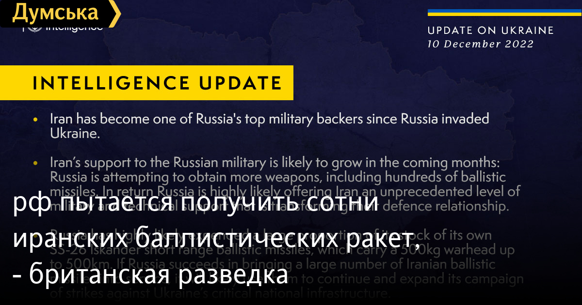 рф пытается получить сотни иранских баллистических ракет, — британская разведкаО росте военной поддержки оккупационных войск рф со стороны Ирана в ближайшие месяцы предупреждает британская разведка. россия пытается получить больше оружия, включая сотни баллистических ракет, говорится в ежедневном разведывательном обзоре оборонного ведомства. «Иран стал одним из главных военных союзников рф после ее вторжения в Украину. В ближайшие месяцы поддержка Ираном российских вооруженных сил, вероятно, возрастет», — сообщают британцы. В ответ рф, скорее всего, предложит Ирану беспрецедентный уровень военной и технической поддержки, что трансформирует их отношения в области обороны, говорится в сводке. Кремль, скорее всего, израсходовал значительную часть своих запасов баллистических ракет малой дальности «Искандер», которые несут 500-килограммовую боеголовку на расстояние до 500 км, добавляют в британской разведке. «Если россии удастся привлечь большое количество иранских баллистических ракет, она, вероятно, будет использовать их для продолжения и расширения своей кампании ударов по критически важной национальной инфраструктуре Украины», — говорится в отчете. СМЕРТЬ РОССИЙСКИМ ОККУПАНТАМ! Заметили ошибку? Выделяйте слова с ошибкой и нажимайте control-enter |