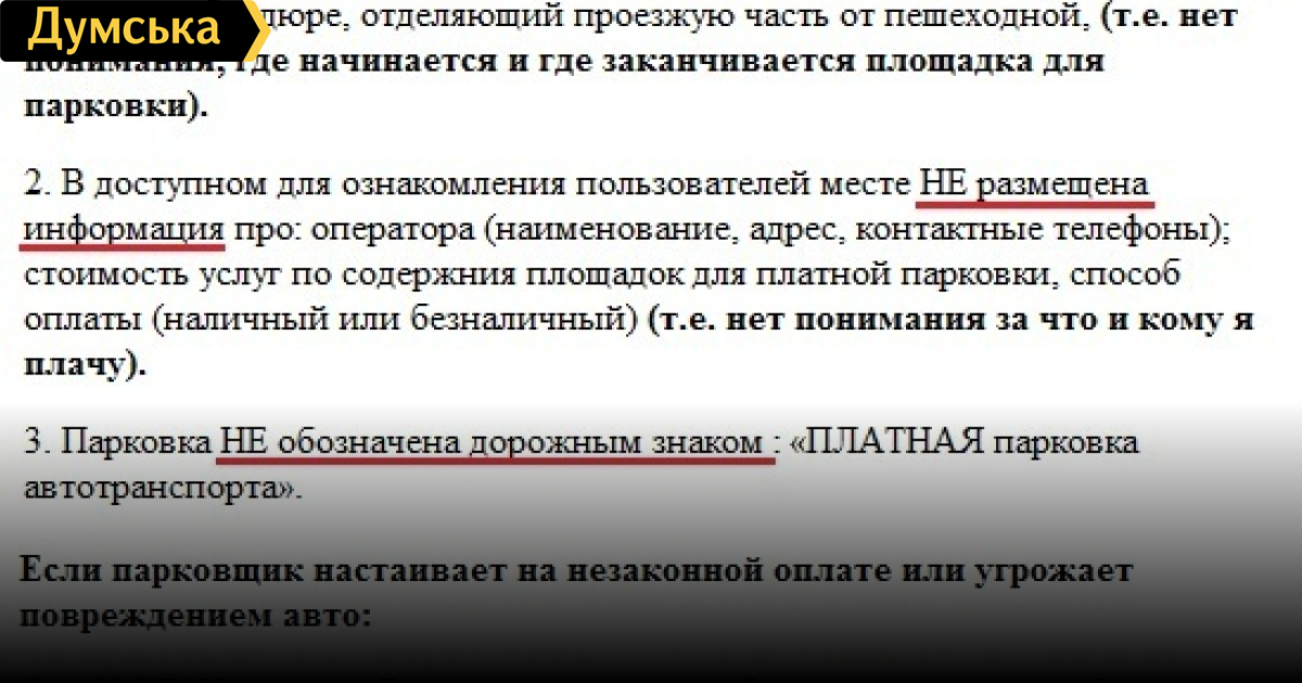 Во-первых, ни одна из парковок не обозначена сплошной синей (голубой) полосой на проезжей части и на бордюре, отделяющий проезжую часть от пешеходной, как должно быть согласно законодательству; во-вторых, в доступном для ознакомления одесситов месте не размещена информация об: операторе (наименование, адрес, контактные телефоны); стоимости услуг по содержанию площадок для платной парковки, способ оплаты (наличный или безналичный); в-третьих, активистами зафиксировано, как парковщики взимают оплату с одесситов в тех местах, где вообще отсутствуют знаки парковки!