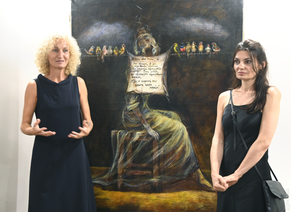 «На питання, як приходить сюжет і як швидко пишуться картини, я отримала відповідь, що робота може писатися і чотири години, і чотири роки, а сюжети приходять самі, — каже господарка «Діалогів» Олена Велика. – Дуже ціную в митцях щирість та готовність оголити свою душу перед глядачем, не боючись критики та засуджень, адже не завжди творчість автора зрозуміла всім та однаково. На перший погляд, великі полотна і темні тони викликають напруженість, але якщо вдивитись у деталі кожної роботи, то можна розгледіти багато сили та віри, багато добра. Автор використовує у своїх роботах багато символів, завдяки яким можна щоразу знаходити нові сенси, закладені у картині».