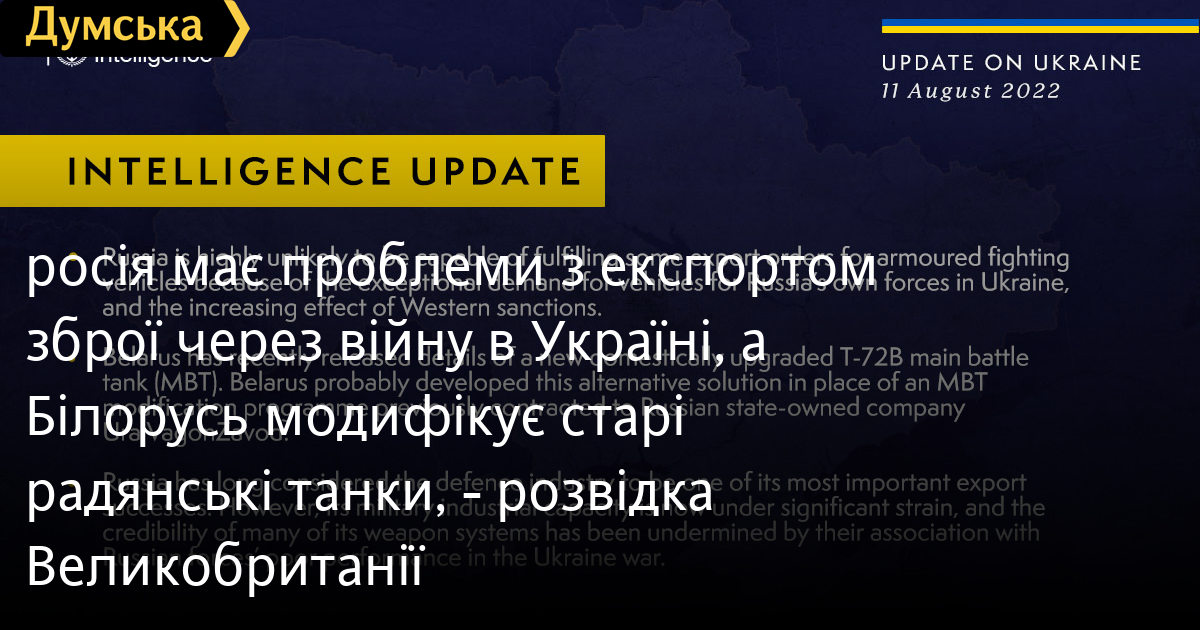 росія навряд чи зможе виконати експортні замовлення на бронетехніку через винятковий попит на озброєння власних сил в Україні та посилення впливу західних санкцій.Як повідомляється в розвідувальному огляді міністерства оборони Великобританії, Білорусь нещодавно оприлюднила подробиці про новий, модернізований всередині країни основний бойовий танк Т-72Б.Скоріш за все, таке оновлення — альтернатива спільній з російською державною компанією «Уралвагонзавод» програмі модифікації військової техніки.«росія довгий час вважала оборонну промисловість одним зі своїх найважливіших експортних успіхів. Однак її військово-промисловий потенціал нині перебуває під значним тиском, а довіра до багатьох її систем озброєння була підірвана через їхній зв'язок з поганою ефективністю російських військ у війні в Україні», — заявили в британській розвідці.