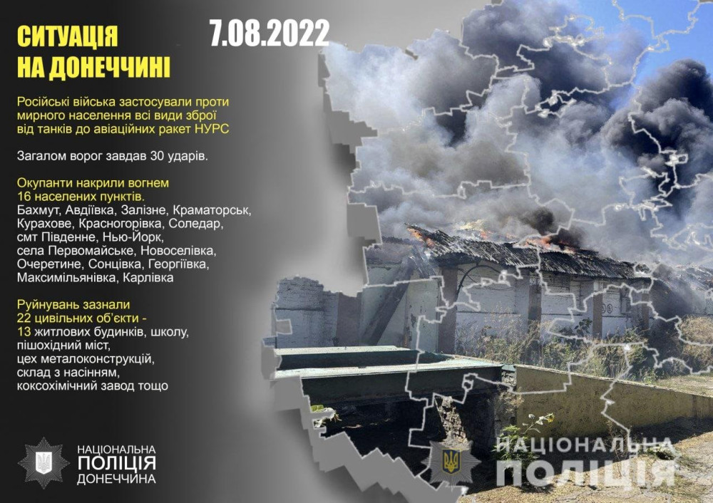 Як повідомляє пресслужба Національної поліціі України, окупанти обстріляли міста Бахмут, Авдіївка, Залізне, Краматорськ, Курахове, Красногорівка, Соледар, смт Південне, Нью-Йорк, села Первомайське, Новоселівка, Очеретине, Сонцівка, Георгіївка, Максимільянівка, Карлівка.