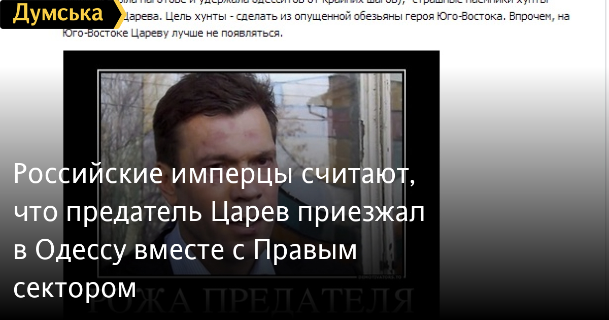 «В Одессу завезли «Правый сектор» вместе с Царевым, и пока одесситы разговаривали с ПС (милиция была наготове и удержала одесситов от крайних шагов), «страшные наемники хунты» «похитили» Царева. Цель хунты — сделать из о….й обезьяны героя Юго-Востока. Впрочем, на Юго-Востоке Цареву лучше не появляться», — написал «евразиец».