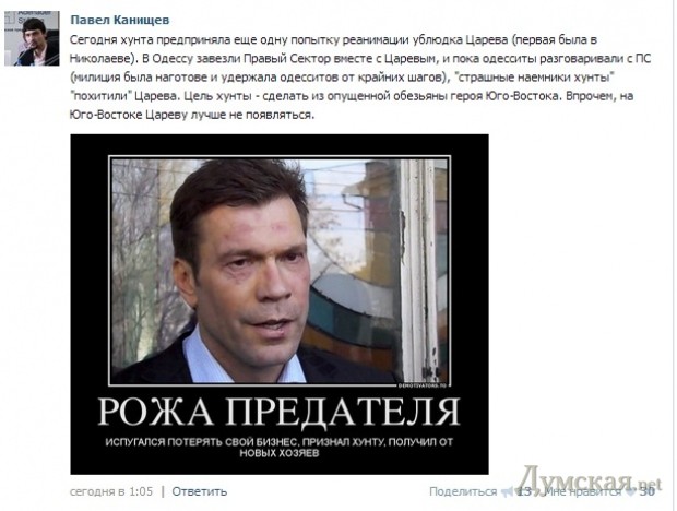 На своей странице «Вконтакте» экстремист назвал депутата «предателем»: мол, тот признал действующее украинское правительство. А вчерашний неудачный визит Царева в Одессу, закончившийся столкновением «россиян» и «украинцев», Канищев считает «спецоперацией хунты»: