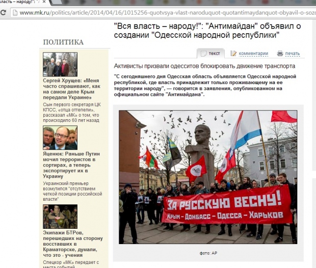 Любопытно, что эта новость удивила активистов «Антимайдана», обитающих на Куликовом поле. Так, Артем Давидченко заявил одесскому изданию «Откат», что до сегодняшнего утра не знал о каких-либо планах по созданию «Одесской народной республики» и впервые услышал об этом от журналистов.