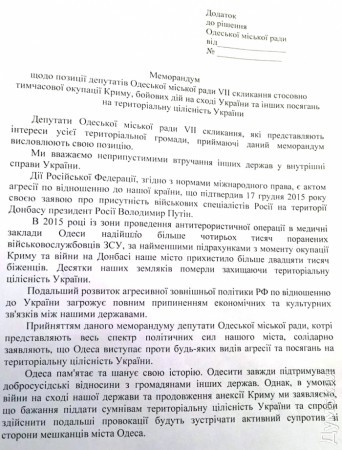 Документ, разработанный рядом общественных организаций, именуется «Меморандумом о позиции депутатов горсовета относительно оккупации Крыма, боевых действий на востоке Украины и других посягательств на территориальную целостность Украины».