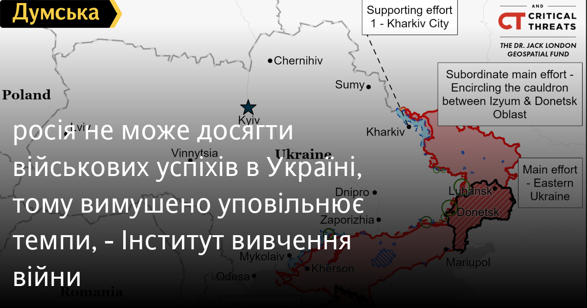 «Міністр оборони Сергій Шойгу підтвердив, що росія не змінила своїх максималістських стратегічних цілей у війні і уповільнює загальний темп наступальних операцій в Україні», — стверджують в ISW.