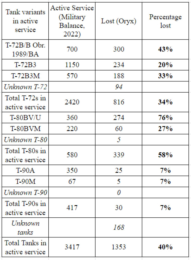 Згідно зі звітами The Military Balance, станом на початок року у вс рф було 3417 танків (без урахування тих, що перебувають на консервації). Українські захисники знищили або захопили 1353 машини, більшість з яких — Т-72.