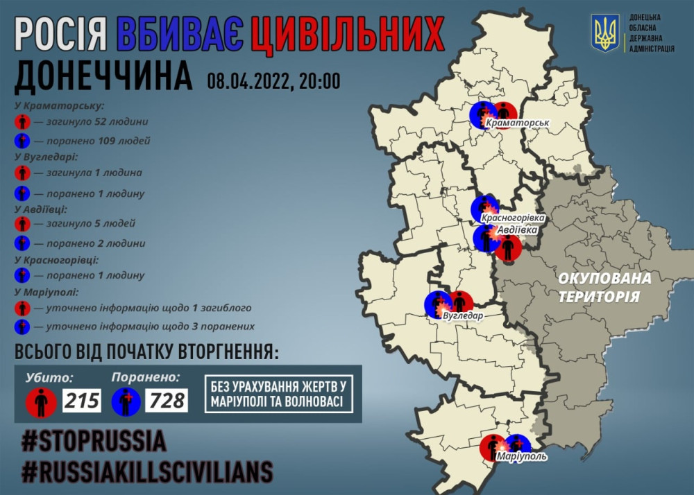 Самым страшным был ракетный удар по вокзалу в Краматорске — там погибли по меньше мере 52 мирных жителя, еще 109 получили ранения. Продолжаются обстрелы жилых кварталов в центре Мариуполя, обстреливали Красногоровку и Угледар.