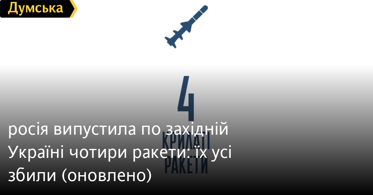 росія випустила по західній Україні чотири ракети: їх усі збили (оновлено)Чотири ракети типу «Калібр», які летіли з акваторії Чорного моря до західних регіонів України, були збиті засобами ППО. Про це повідомили у Повітряному командуванні «Захід». Зазначається, що ракети були націлені на важливі критичні об'єкти інфраструктури. ОНОВЛЕНО О 18:20. В Оперативному командуванні «Південь» повідомили, що один «калібр» було збито над Одеською областю. ОБНОВЛЕНО О 18:38. Повітряне командування Збройних сил України повідомило, що всього сьогодні було збито п'ять калібрів. СМЕРТЬ РОСІЙСЬКИМ ОКУПАНТАМ! Помітили помилку? Виділяйте слова з помилкою та натискайте control-enter |