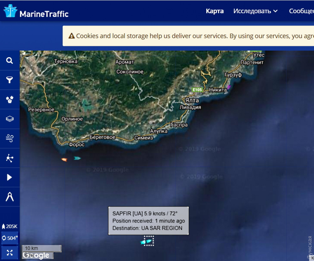 ОБНОВЛЕНО В 12:05 Украинские буксиры «Титан», «Гайдамака» и спасательное судно «Сапфир» продолжают движение в восточном направлении. Сейчас они находятся примерно в 35 км южнее Ялты. Видимо, рандеву состоится в международных водах, в том месте, где были захвачены наши корабли.