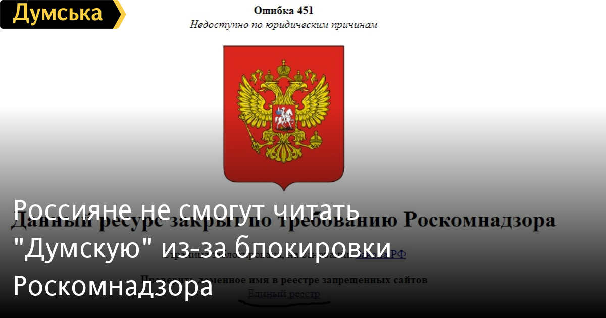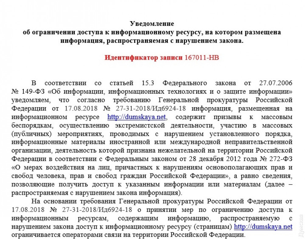 Как говорится в сообщении, которое редакция получила по электронной почте, российское цензурное ведомство выполнило требование генеральной прокуратуры РФ, поскольку одна из публикаций «Думской» якобы содержит «призывы к массовым беспорядкам, осуществлению экстремистской деятельности, участию в массовых (публичных) мероприятиях, проводимых с нарушением установленного порядка».