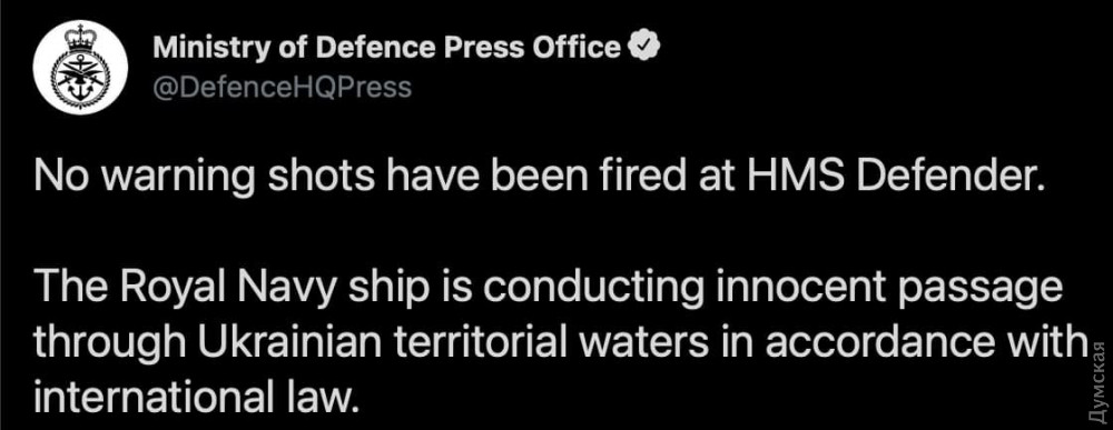 «По эсминцу «Дефендер» предупредительных выстрелов сделано не было. Корабль Королевских военно-морских сил проводит ничего не нарушающий проход по украинским территориальным водам в соответствии с международным правом. Мы считаем, что россияне проводили учения со стрельбой в Черном море и дали международному сообществу предупреждение о своей деятельности. В направлении «Дефендера» не производилось никаких выстрелов и мы не признаем утверждения, что на его пути были сброшены бомбы», — сообщили в ведомстве.