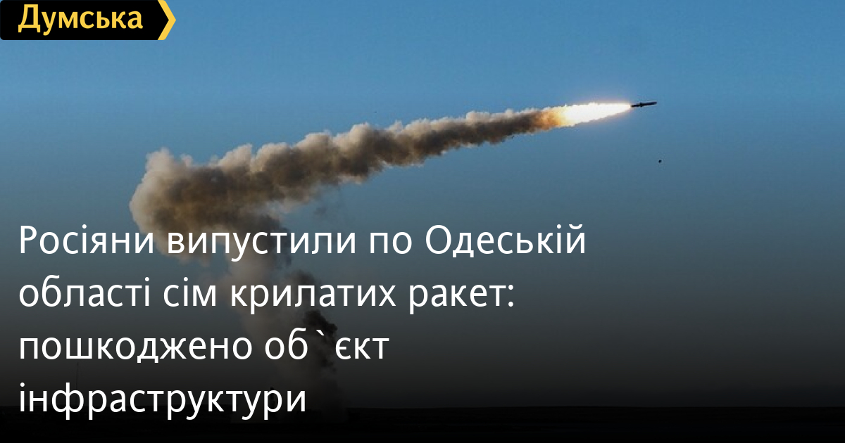 Сім ракет різного типу випустив сьогодні вдень ворог по інфраструктурному об'єкту в Білгород-Дністровському районі Одеської області.
