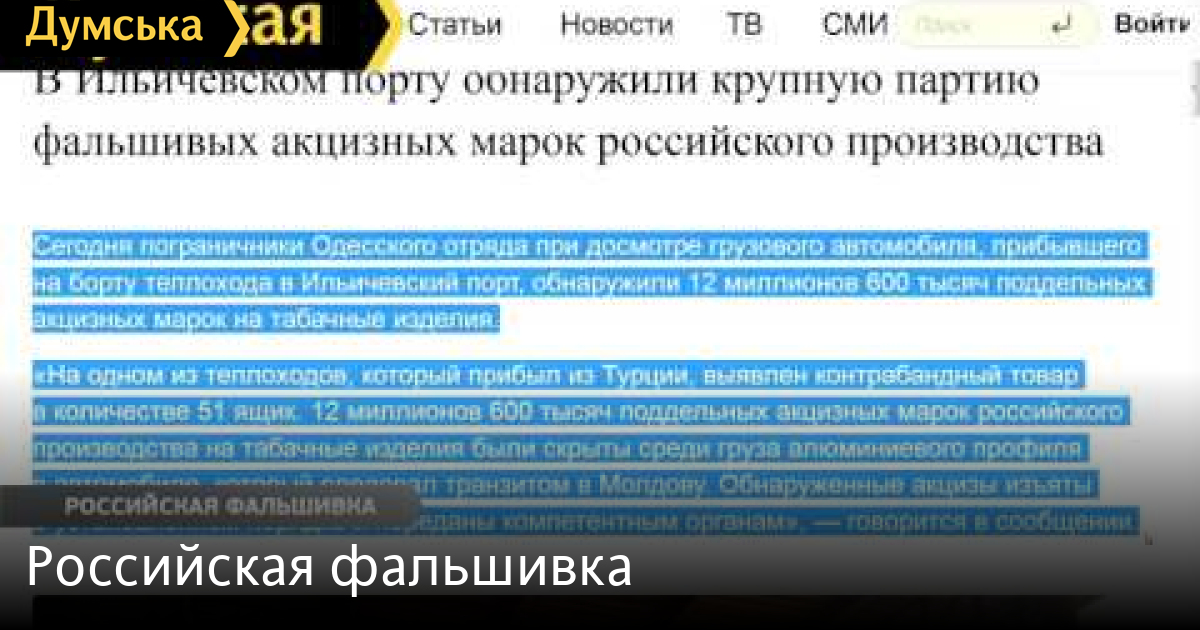 Российская фальшивка. Более двенадцати с половиной миллионов поддельных акцизных марок на табачные изделия пытались переправить в Молдову через Ильичевский порт. СМЕРТЬ РОССИЙСКИМ ОККУПАНТАМ! Заметили ошибку? Выделяйте слова с ошибкой и нажимайте control-enter Думская ТВ. Сюжеты: