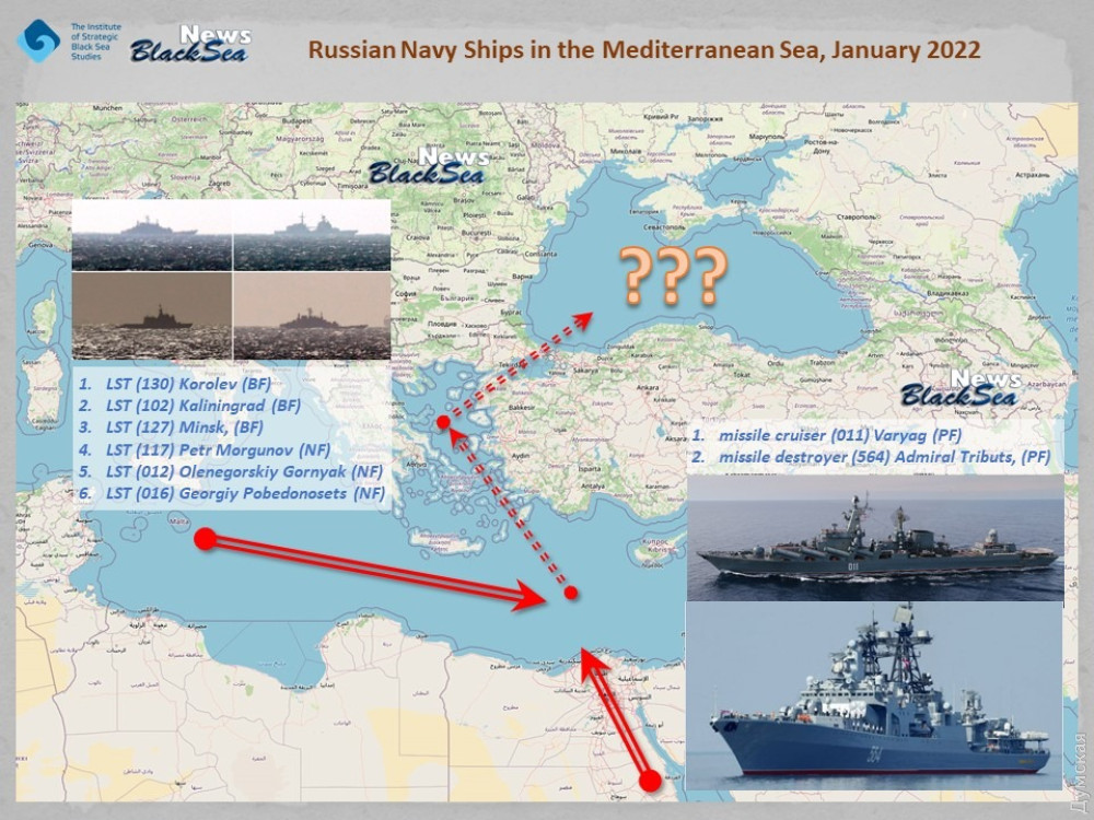 Напомним, во время предыдущего накопления российских сил у границ Украины весной прошлого года в Черном море было восемь БДК, а также зашла флотилия десантных катеров из Каспийского моря.