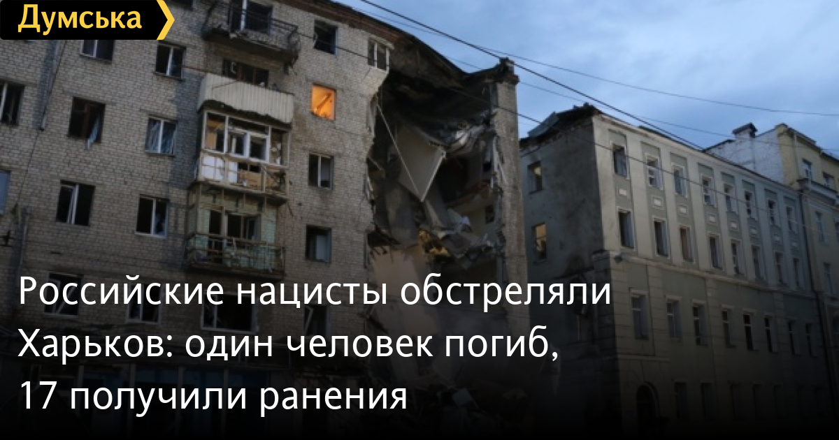 Російські нацисти обстріляли Харків: одна людина загинула, 17 отримали пораненняРоссийские оккупанты утром 21 июля нанесли ракетный удар по одному из густонаселенных микрорайонов Харькова. Как сообщил председатель Харьковской ОВА Олег Синєгубов, в результате удара один человек погиб, 17 - получили ранения. «Враг обстрелял людей, которые были на улицах, стояли на остановках, просто шли по своим делам», — уточнил Синегубов. Он отметил, что сейчас на месте обстрелов работают все экстренные службы и призвал горожан находиться в укрытиях и не игнорировать сигналы тревоги. Мэр Харькова Игорь Терехов добавил, что есть попадание в одно из медучреждений города. СМЕРТЬ РОСІЙСЬКИМ ОКУПАНТАМ! Помітили помилку? Виділяйте слова з помилкою та натискайте control-enter |