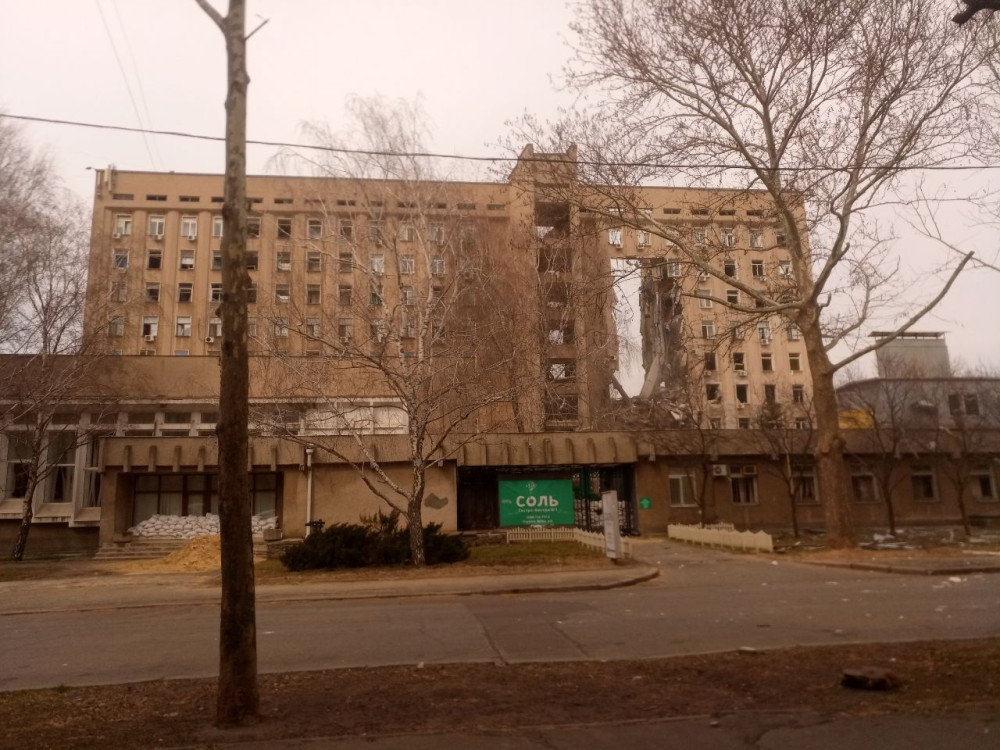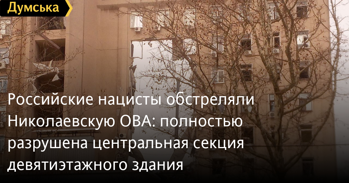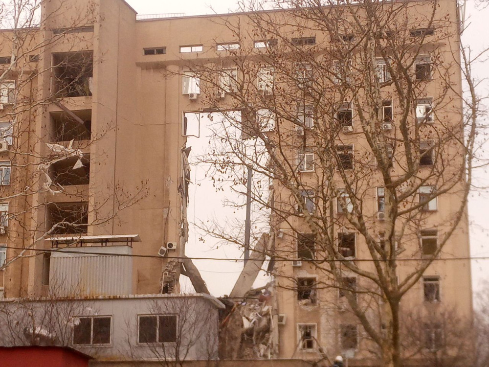 В результате ракетного обстрела и попадания в девятиэтажное здание Николаевской ОВА произошло разрушение его центральной секции с девятого по первый этаж без последующего горения.