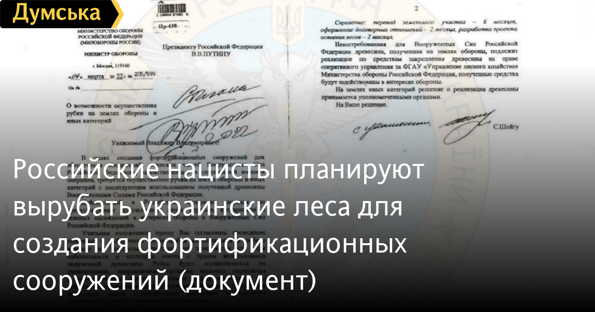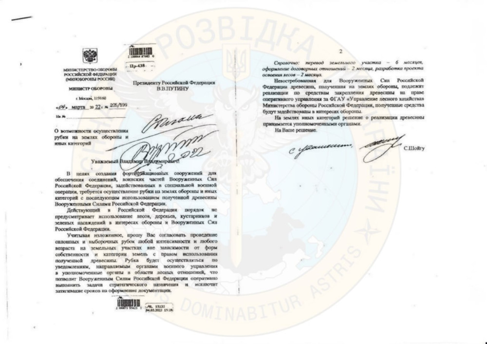 В документе руководитель российского военного ведомства просит разрешение начать вырубку украинских «лесов, деревьев, кустарников и зеленых насаждений» для строительства фортификационных сооружений.