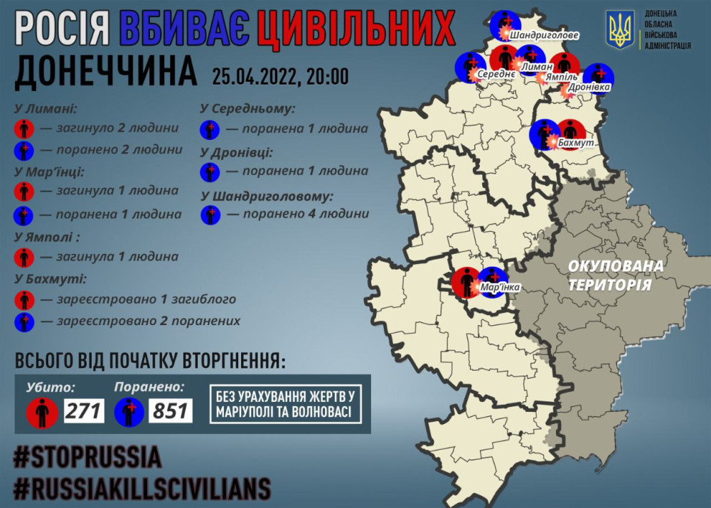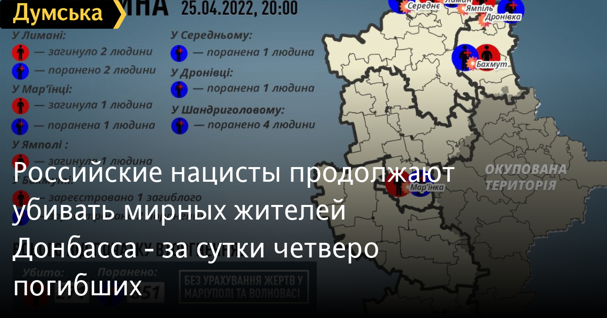 Четверо мирных жителей погибли в результате вражеских обстрелов Донецкой области 25 апреля — двое в Лимане, один в Марьинке и один в Ямполе.