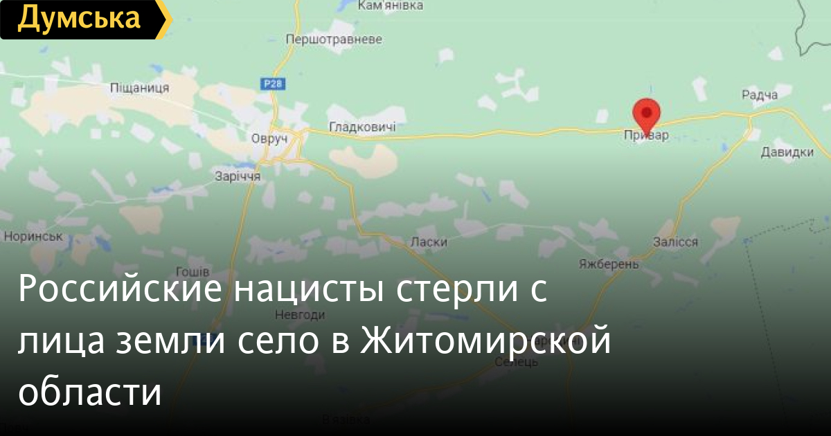 «Сегодня, в 10:00, с вертолета было расстреляно с. Привар Овручской громады. Село полностью разрушено. Погибших нет, поскольку жители села прятались в подвалах».