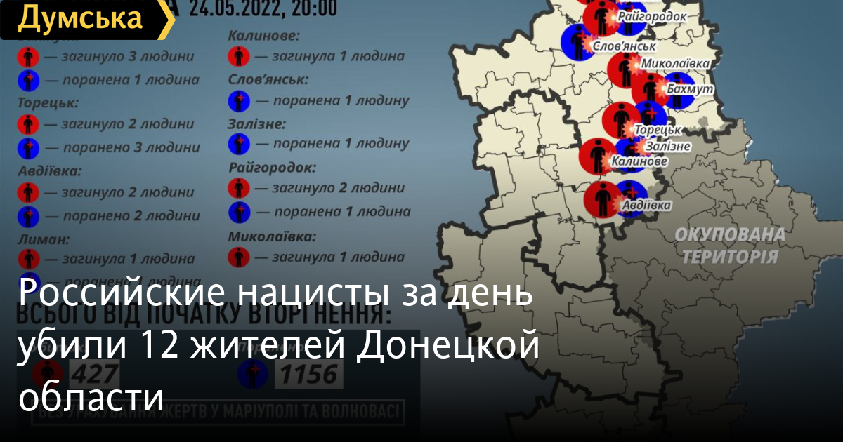 «За 24 мая россияне убили 12 мирных жителей Донецкой области: троих – в Бахмуте, двоих – в Торецке, двоих – в Авдеевке, двоих – в Райгородке, одного – в Лимане, одного – в Николаевке и одного – в Калиновом. Еще 10 человек получили ранения», – отметил он.
