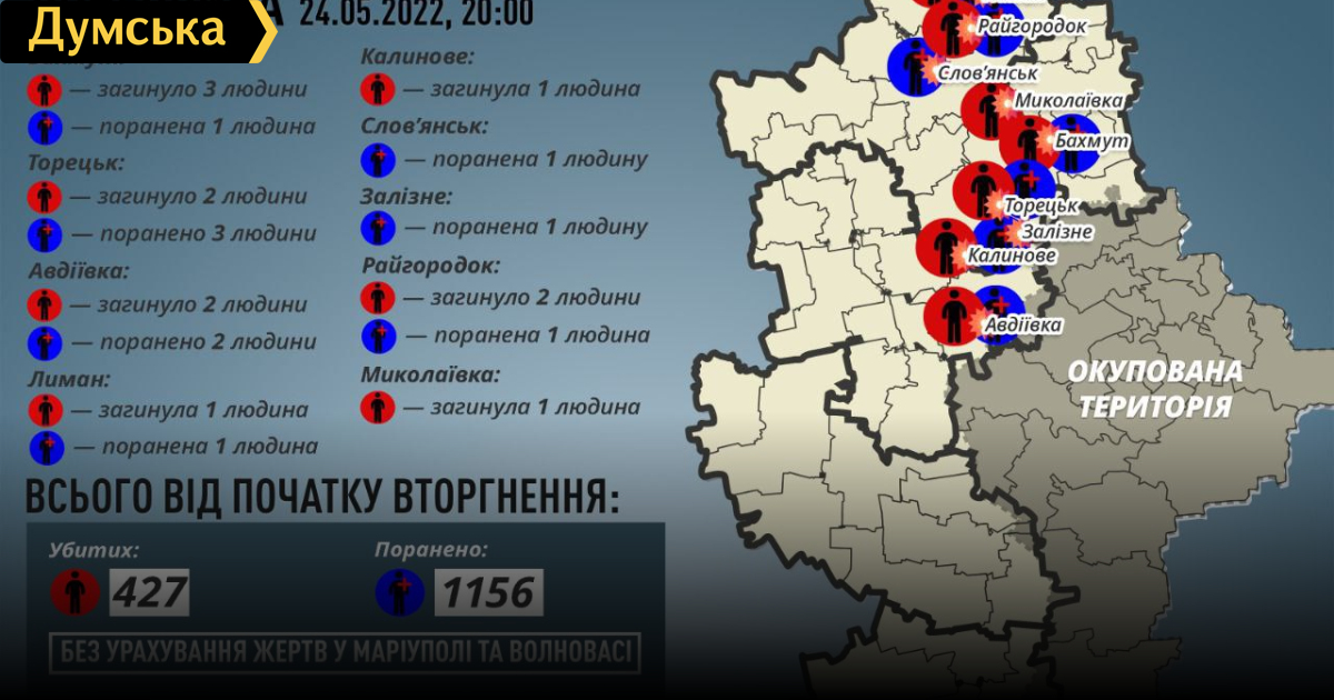 «За 24 мая россияне убили 12 мирных жителей Донецкой области: троих – в Бахмуте, двоих – в Торецке, двоих – в Авдеевке, двоих – в Райгородке, одного – в Лимане, одного – в Николаевке и одного – в Калиновом. Еще 10 человек получили ранения», – отметил он.