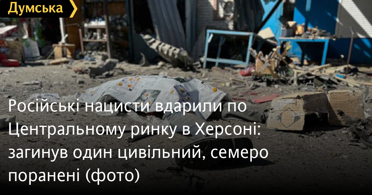 Російські нацисти вдарили по Центральному ринку в Херсоні: загинув один цивільний, семеро пораненіОкупанти завдали ракетного удару по центру Херсона — вибухи прогриміли на Центральному ринку. Голова обласної військової адміністрації Олег Прокудін повідомив, що внаслідок обстрілу загинув один цивільний, семеро поранені. Він зазначив, що в районі, куди прилетіли ворожі ракети, немає жодних військових об'єктів. СМЕРТЬ РОСІЙСЬКИМ ОКУПАНТАМ! Помітили помилку? Виділяйте слова з помилкою та натискайте control-enter |