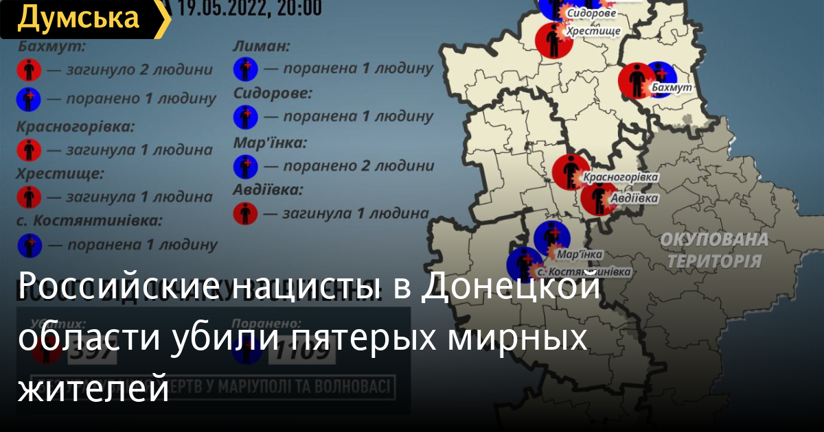 «За 19 мая россияне убили пять мирных жителей Донбасса: 2 в Бахмуте, 1 в Красногоровке, 1 в Авдеевке и 1 в Крестище. Еще 6 человек получили ранения», — говорится в сообщении.