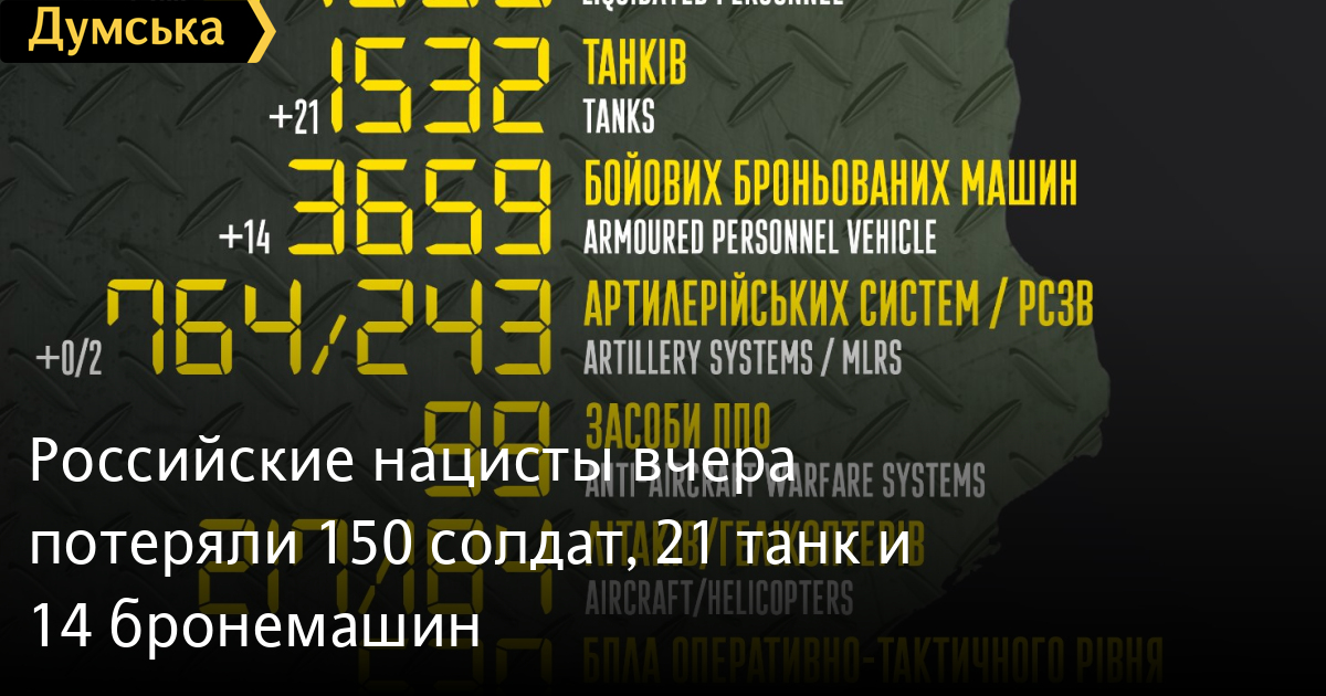 По данным Генерального штаба Вооруженных сил Украины, наши защитники вчера сожгли 21 вражеский танк и 14 бронемашин.