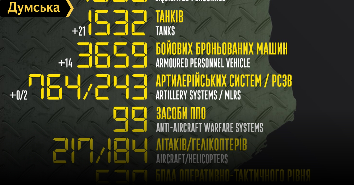 Силы обороны Украины продолжают уничтожать пришедших на нашу землю оккупантов. Вчера нашли свой конец 150 вражеских солдат и офицеров, всего же с начала войны уничтожены уже 34850 захватчиков. По данным Генерального штаба Вооруженных сил Украины, наши защитники вчера сожгли 21 вражеский танк и 14 бронемашин. Также уничтожены две реактивные системы залпового огня и четыре автомобиля. За сутки были сбиты четыре беспилотника оперативно-тактического уровня. СМЕРТЬ РОСІЙСЬКИМ ОКУПАНТАМ! Помітили помилку? Виділяйте слова з помилкою та натискайте control-enter |