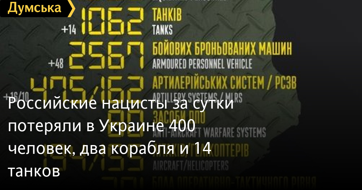 400 солдат, 14 танков и два корабля потеряли российские нацисты за минувшие сутки в Украине.