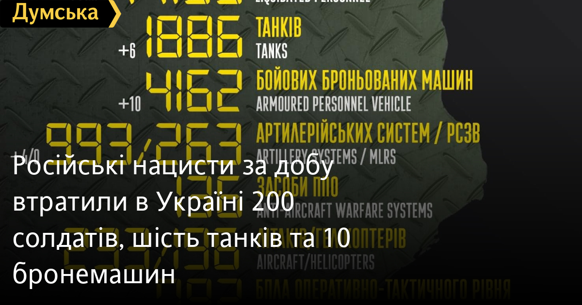 Сили оборони України продовжують знищувати російських загарбників, що вторглися. Минулої доби окупанти втратили 200 солдатів і офіцерів, втрати ворога з 24 лютого вже становлять 44100 військовослужбовців.