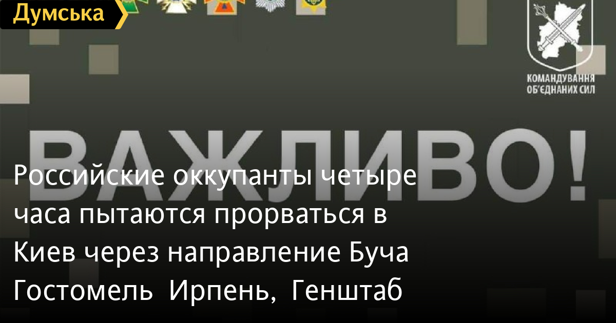 В Киевской области остаются сложными направления Буча – Гостомель – Ирпень. Последние четыре часа российские оккупаниты пытаются прорваться. В Буче удалось остановить передвижение колонны военной техники, противник бросил технику и отступил.