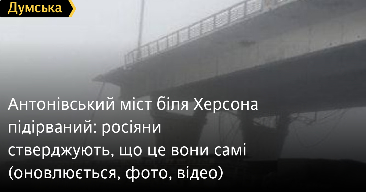 Антонівський міст біля Херсона підірваний: росіяни стверджують, що це вони самі (оновлюється, фото, відео)Антонівський міст, що біля Херсона, підірвано. Російські пропагандистські ЗМІ, які опублікували відео споруди, стверджують, що це зробили окупанти, які відступають зараз на лівий берег Дніпра. Зазначається, що вибухом зруйновано два прольоти. Українське видання «Суспільне Херсон» оприлюднило фотографію мосту, зроблену місцевими жителями. На ній видно, що він зруйнований у кількох місцях і частково обвалився. СМЕРТЬ РОСІЙСЬКИМ ОКУПАНТАМ! Помітили помилку? Виділяйте слова з помилкою та натискайте control-enter |