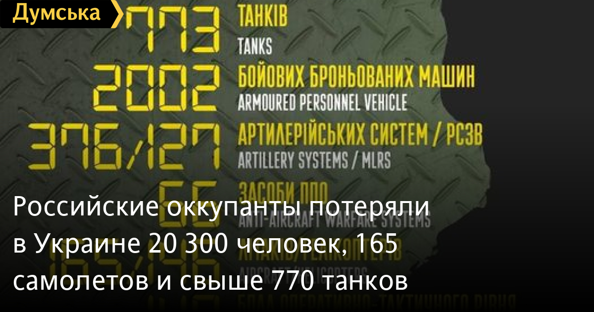 Российские оккупанты потеряли в Украине 20 300 человек, 165 самолетов и свыше 770 танковС начала полномасштабного военного вторжения рф в Украину противник потерял уже 20 300 человек личного состава. Об этом сообщили в Генштабе. Кроме того, общие боевые потери противника на сегодняшний день ориентировочно составили: танков ‒ 773 единицы; боевых бронированных машин ‒ 2002 единицы; артиллерийских систем – 376 единиц; РСЗО — 127 единиц; средства ПВО - 66 единиц; самолетов – 165 единиц; вертолетов – 146 единиц; автомобильной техники — 1471 единицу; корабли/катера — 8 единиц; цистерн с ГСМ - 76; БПЛА оперативно-тактического уровня – 148; специальная техника – 27; пусковые установки ОТРК/ТРК — 4. СМЕРТЬ РОССИЙСКИМ ОККУПАНТАМ! Заметили ошибку? Выделяйте слова с ошибкой и нажимайте control-enter |