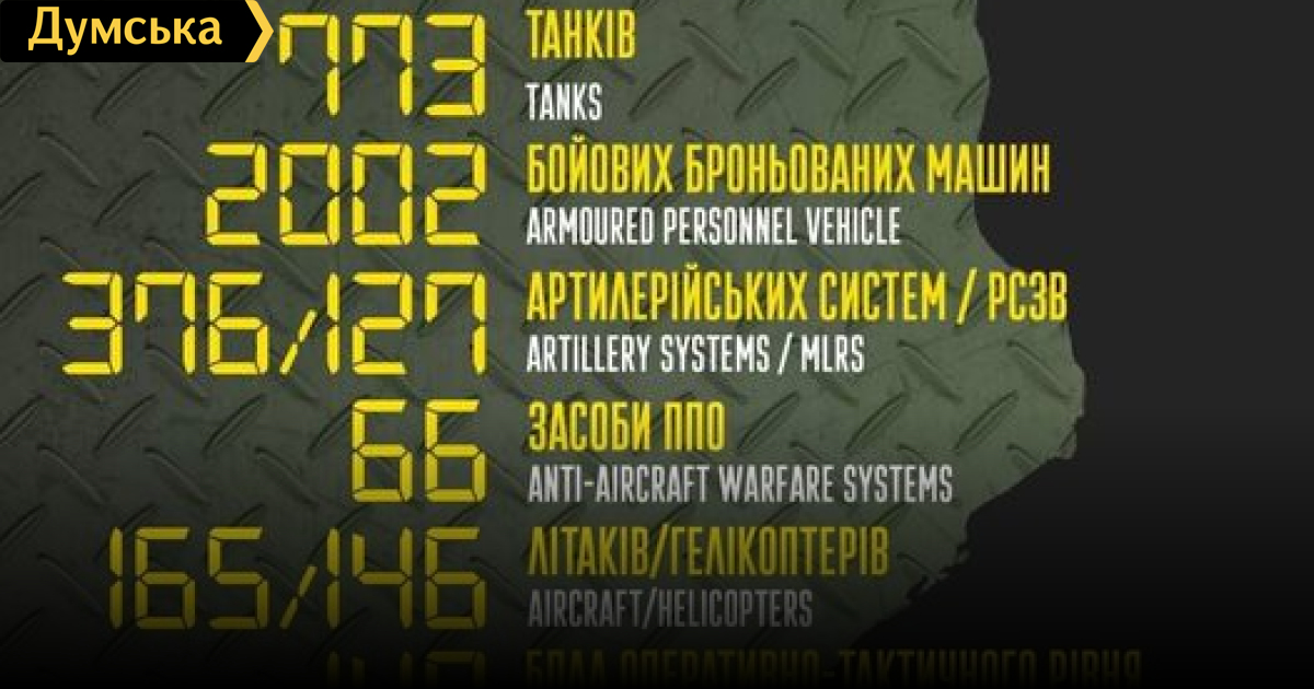 Российские оккупанты потеряли в Украине 20 300 человек, 165 самолетов и свыше 770 танковС начала полномасштабного военного вторжения рф в Украину противник потерял уже 20 300 человек личного состава. Об этом сообщили в Генштабе. Кроме того, общие боевые потери противника на сегодняшний день ориентировочно составили: танков ‒ 773 единицы; боевых бронированных машин ‒ 2002 единицы; артиллерийских систем – 376 единиц; РСЗО — 127 единиц; средства ПВО - 66 единиц; самолетов – 165 единиц; вертолетов – 146 единиц; автомобильной техники — 1471 единицу; корабли/катера — 8 единиц; цистерн с ГСМ - 76; БПЛА оперативно-тактического уровня – 148; специальная техника – 27; пусковые установки ОТРК/ТРК — 4. СМЕРТЬ РОСІЙСЬКИМ ОКУПАНТАМ! Помітили помилку? Виділяйте слова з помилкою та натискайте control-enter |