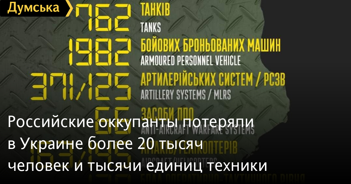 С начала полномасштабного военного вторжения рф в Украину противник потерял уже порядка 20 100 человек личного состава.