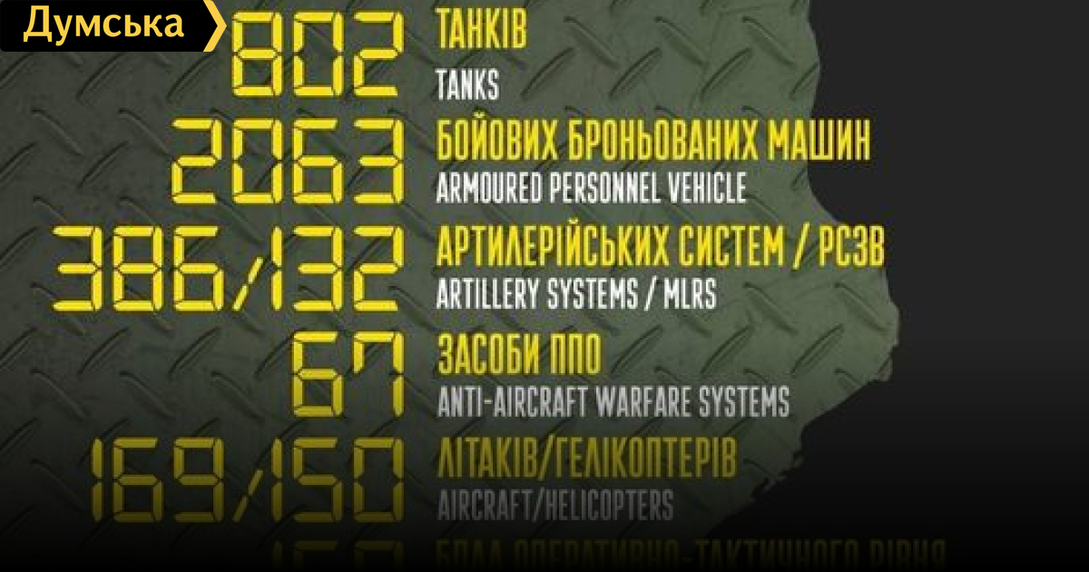 Российские оккупанты потеряли в Украине почти 21 тысячу человек, более 800 танков и 169 самолетовРоссийские оккупанты с начала полномасштабного военного вторжения в Украину потеряли уже 20 800 человек личного состава. Об этом сообщили в Генштабе. Там отметили, что общие боевые потери противника на сегодняшний день ориентировочно составили: танков ‒ 802 единицы; боевых бронированных машин ‒ 2063 единицы; артиллерийских систем – 386 единиц; РСЗО — 132 единицы; средства ПВО - 67 единиц; самолетов – 169 единиц; вертолетов – 150 единиц; автомобильной техники — 1495 единиц; корабли/катера- 8 единиц; цистерн с ГСМ - 76; БПЛА оперативно-тактического уровня – 158; специальная техника – 27; пусковые установки ОТРК/ТРК — 4. СМЕРТЬ РОСІЙСЬКИМ ОКУПАНТАМ! Помітили помилку? Виділяйте слова з помилкою та натискайте control-enter |