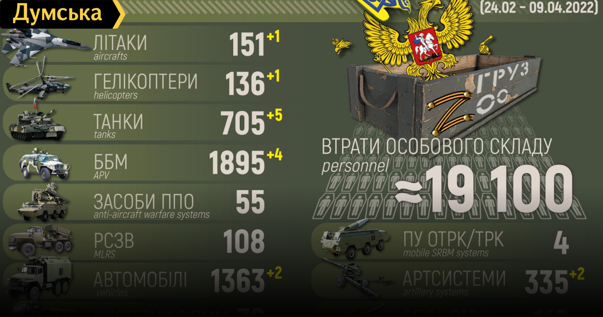 Российские оккупанты потеряли в Украине свыше 19 тысяч человек, больше 700 танков и 150 самолетовС начала полномасштабного вторжения рф в Украину оккупанты потеряли уже 19 100 человек личного состава. Об этом сообщили в Генштабе. Кроме того, общие боевые потери противника с 24 февраля составили: танков ‒ 705 единиц; боевых бронированных машин ‒ 1895 единиц; артиллерийских систем – 335 единиц; РСЗО — 108 единиц; средства ПВО - 55 единиц; самолетов – 151 единица; вертолетов – 136 единиц; автомобильной техники — 1363 единицы; корабли/катера — 7 единиц; цистерн с ГСМ - 76; БПЛА оперативно-тактического уровня – 112; специальная техника – 25; пусковые установки ОТРК — 4. СМЕРТЬ РОСІЙСЬКИМ ОКУПАНТАМ! Помітили помилку? Виділяйте слова з помилкою та натискайте control-enter |