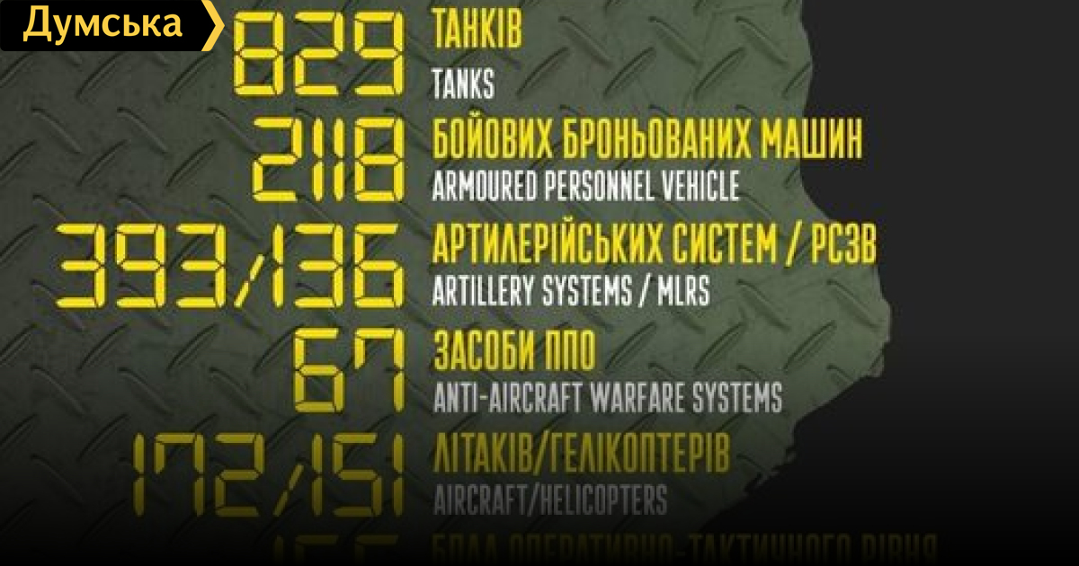 С начала полномасштабного вооруженного вторжения россии в Украину оккупанты потеряли уже 21 тысячу человек личного состава. Об этом сообщили в Генштабе. Кроме того, на сегодняшний день ориентировочные потери врага составили: танков 829 единиц; боевых бронированных машин 2118 единиц; артиллерийских систем – 393 единицы; РСЗО- 136 единиц; средства ПВО - 67 единиц; самолетов – 172 единицы; вертолетов – 151 единица; автомобильной техники — 1508 единиц; корабли/катера — 8 единиц; цистерн с ГСМ - 76; БПЛА оперативно-тактического уровня – 166; специальная техника – 27; пусковые установки ОТРК/ТРК — 4. СМЕРТЬ РОСІЙСЬКИМ ОКУПАНТАМ! Помітили помилку? Виділяйте слова з помилкою та натискайте control-enter |
