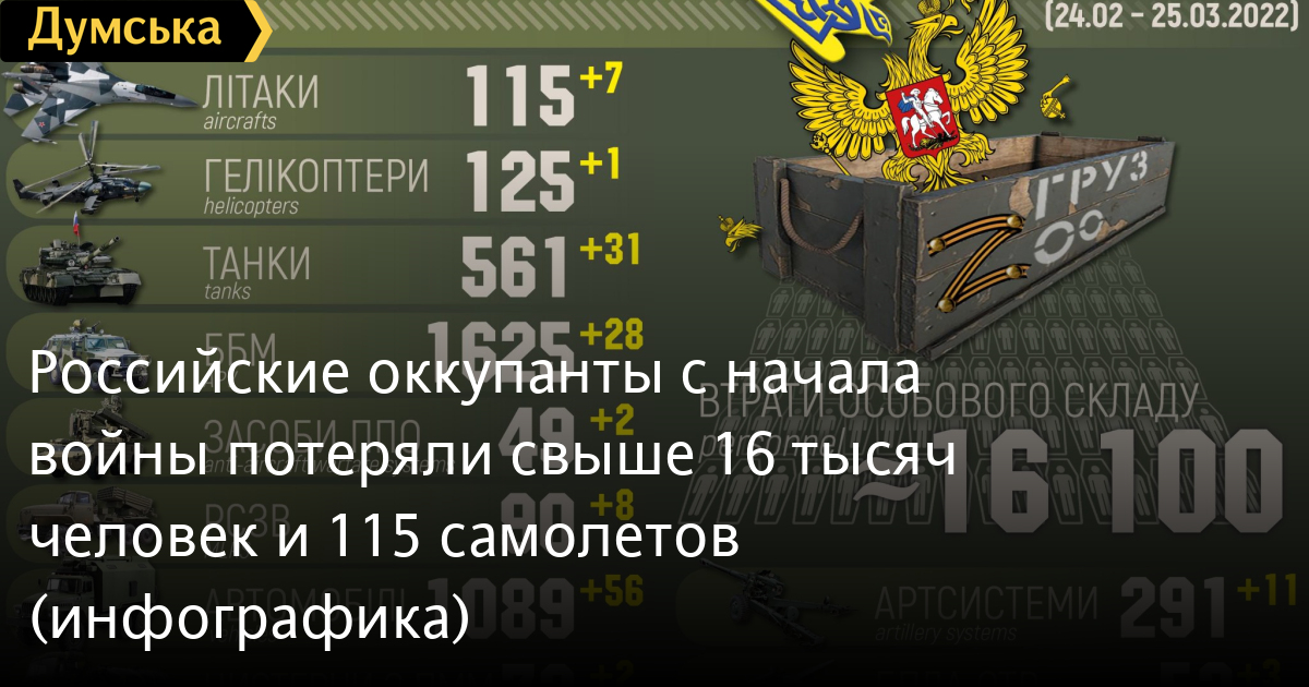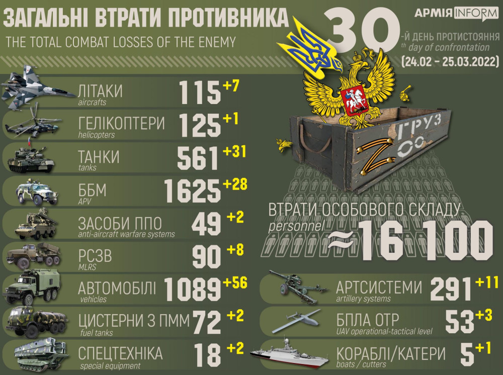 Так, общие боевые потери противника с 24 февраля по 25 марта ориентировочно составили: