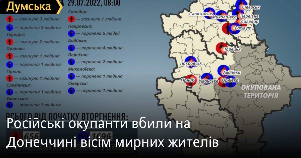 Минулої доби внаслідок ворожих обстрілів на Донеччині загинули вісім мирних жителів, ще 19 отримали поранення. Про це повідомив голова Донецької ОВА Павло Кириленко. «За 28 липня росіяни вбили вісім мирних жителів Донбасу: трьох у Бахмуті, двох у Торецьку, одного в Орлівці, одного у Гірнику та одного у Соледарі. Ще 19 людей отримали поранення», — уточнив Кириленко. Він додав, що встановити точну кількість жертв у Маріуполі та Волновасі зараз неможливо. СМЕРТЬ РОСІЙСЬКИМ ОКУПАНТАМ! Помітили помилку? Виділяйте слова з помилкою та натискайте control-enter |