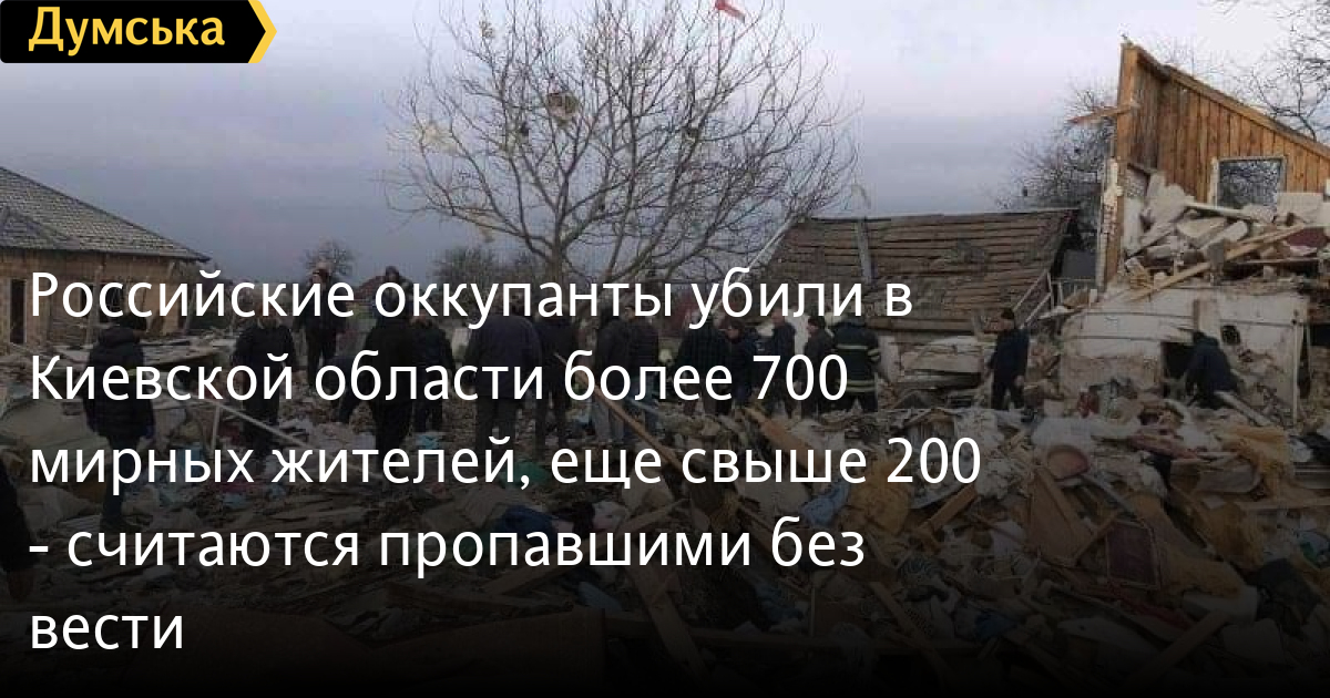 Российские оккупанты убили в Киевской области более 700 мирных жителей, еще свыше 200 - считаются пропавшими без вестиНа данный момент в Киевской области количество погибших от рук российских оккупантов среди мирного населения составляет более 720 человек. Об этом сообщил начальник полиции Киевской области Андрей Небитов. «Количество обнаруженных и осмотренных тел погибших мирных лиц в Киевской области в результате российской агрессии составляет уже более 720 человек, еще более 200 человек считаются пропавшими без вести», — уточнил Небитов. По его словам, правоохранители зарегистрировали более 150 фактов мародерства и уже сообщили о подозрении 35 лицам, зарегистрировали более 30 уголовных производств по коллаборационной деятельности, собрали материалы по содействию агрессору и уже сообщили о подозрении пяти лицам. С начала войны на территории столичного региона зафиксировано более 3050 уголовных производств относительно преступлений, совершенных военными рф. СМЕРТЬ РОССИЙСКИМ ОККУПАНТАМ! Заметили ошибку? Выделяйте слова с ошибкой и нажимайте control-enter |