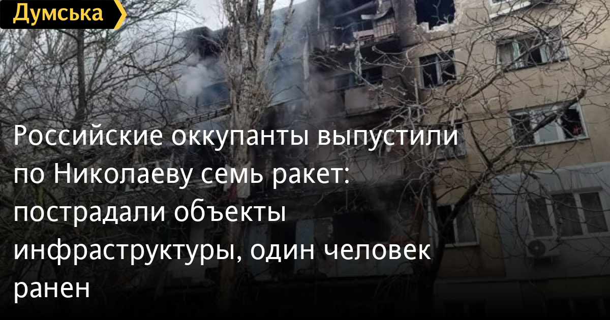 Російські окупанти випустили по Миколаєву сім ракет: постраждали об'єкти інфраструктури, одна людина пораненаВ ночь на 21 июля российские оккупанты выпустили по Николаеву семь ракет С-300, нанеся городу значительные разрушения. Об этом сообщил председатель Николаевской ОВА Виталий Ким. «Около 03:05, 21 июля, российские оккупанты выпустили по городу семь ракет С-300. По предварительной информации, известно о попадании в объект инфраструктуры, АЗС, газопровод и складское помещение. Спасательными службами ликвидированы все возгорания, которые возникли в результате обстрелов», — заявил Ким. Он добавил, что сейчас известно об одном пострадавшем, более подробная информация уточняется. Вблизи Николаева оккупанты наносили удары по селу Лиманы (разрушены жилые дома, хозяйственные постройки, пострадавших нет), между населенными пунктами Котляревое и Зеленый Гай (загорелись поля с зерновыми, пострадавших нет). Также ночью обстреливали Баштанскую громаду, есть «прилеты» по деревням, часть вражеских снарядов не разорвалась, информация о пострадавших и повреждениях уточняется. «Под постоянными обстрелами остаются села, находящиеся на линии разграничения. Информация о пострадавших отсутствует. Информация о разрушениях жилых домов уточняется», — уточнил глава ОВА. СМЕРТЬ РОСІЙСЬКИМ ОКУПАНТАМ! Помітили помилку? Виділяйте слова з помилкою та натискайте control-enter |
