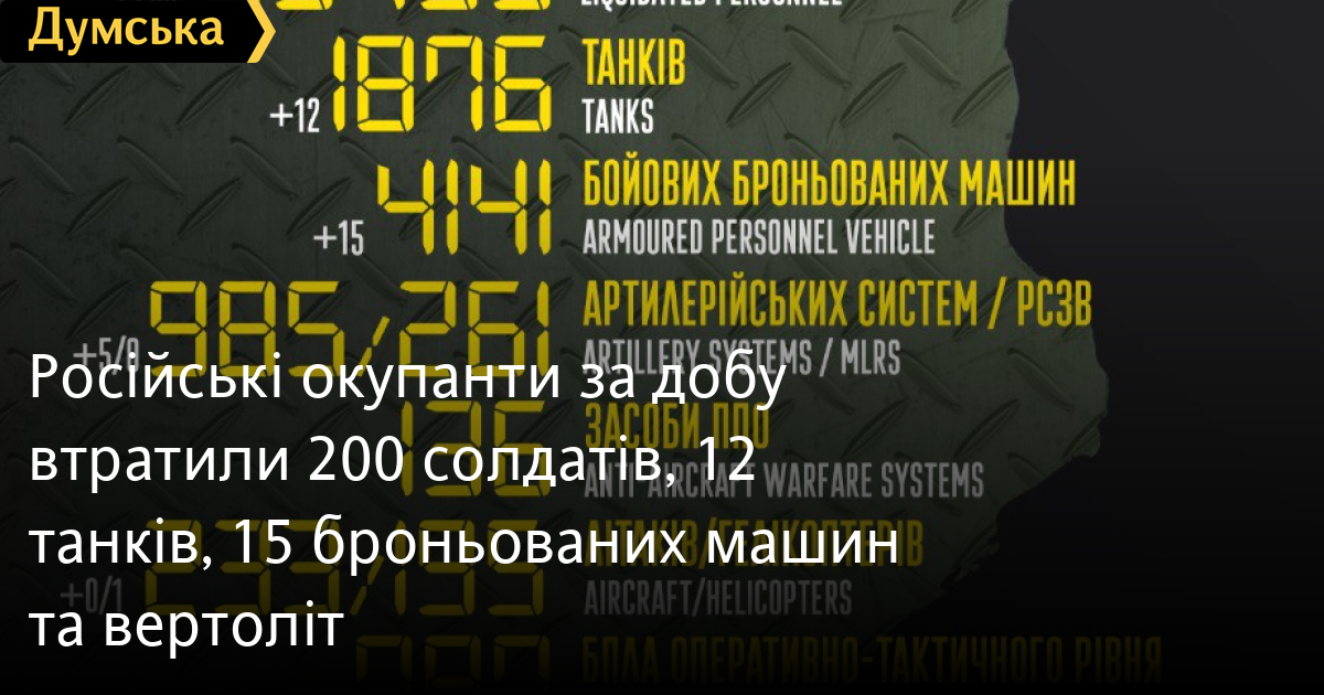 За даними Генерального штабу Збройних сил України, напередодні було знищено 12 танків та 15 бронемашин противника, спалено п'ять артилерійських систем, п'ять вантажівок та одну одиницю спецтехніки.